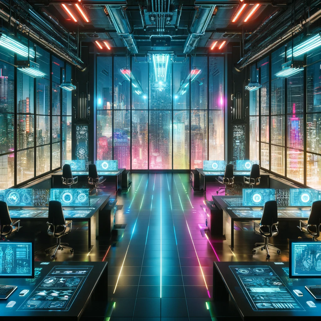 DALL·E 2024-04-01 19.10.12 – Visualize a high-tech office set in a cyberpunk future. This office is located in a towering skyscraper, with panoramic windows